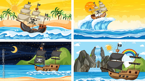 Couple trekking in mountains. Travel adventure and hiking concept vector posters set. People climb mountain. Man and woman with backpack in outdoor nature landcape. Trekking boot closeup view.