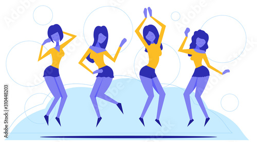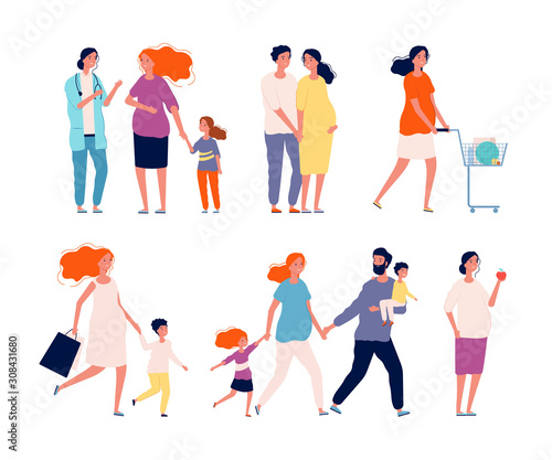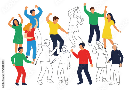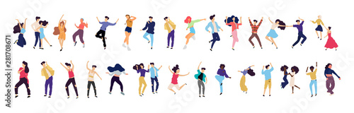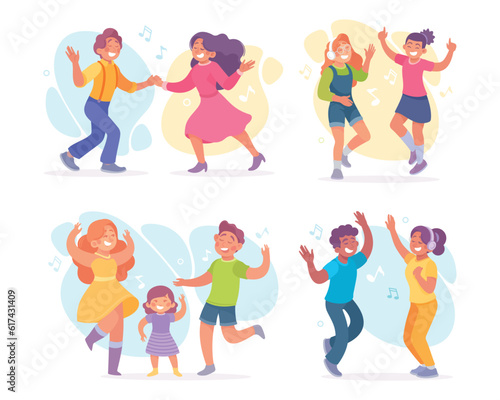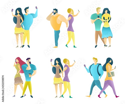 Couples using mobile phones. Vector illustration isolated on white background. Young pairs talking, listening to music, taking selfie, emailing, texting messages on the move.