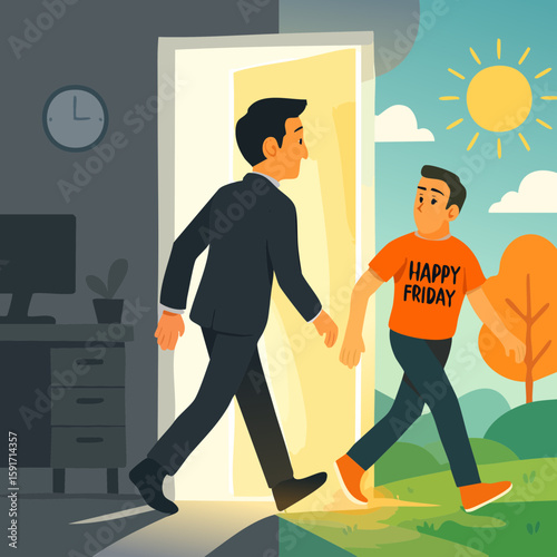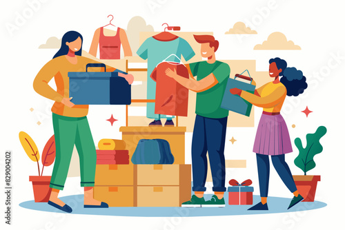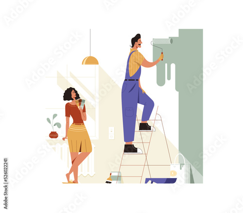 Delivery man, courier in face mask delivering food products to home door, giving grocery bag to customer female, flat vector illustration. Home delivery services during corona virus covid-19 pandemic.