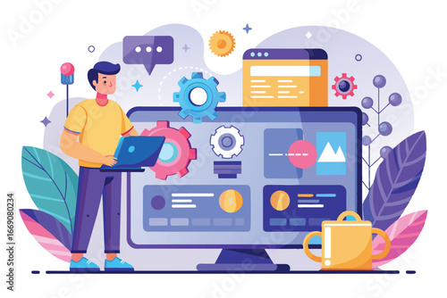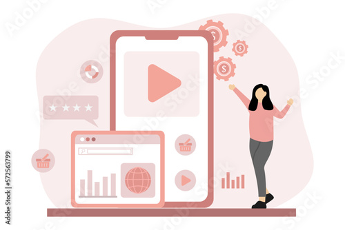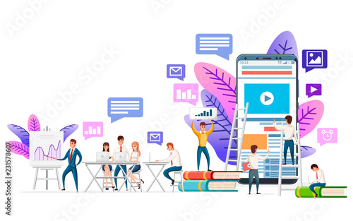 Delivery company couriers, male and female characters delivering fast food, groceries, gifts, flowers to customers, flat vector illustration. Online ordering and delivery service.