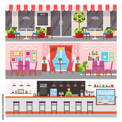 Vector set of courtroom interior posters, banners with jury box, furniture and equipment for court hearing. Flat style design illustration.