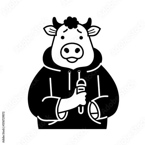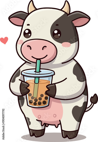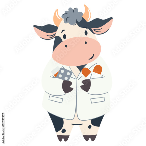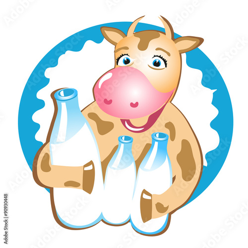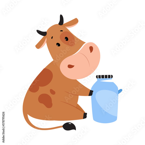 Cow with milk can and bottle vector. Funny farm animal cartoon character holding glassware with fresh dairy product standing near metal canister dairy isolated on white background