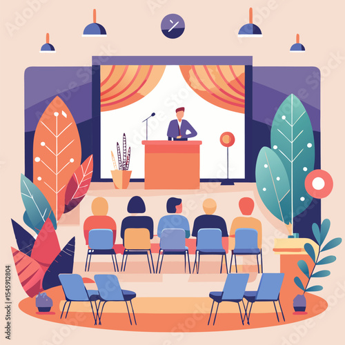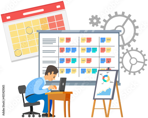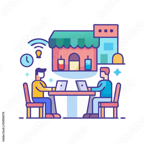 Coworking center concept vector illustration. Coworking team. People making use of laptops, tablet, headset and headphones. Flat style design.