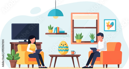 Coworking center concept vector illustration in flat style. Coworking team. Young men and woman making use of laptops and smart phone.