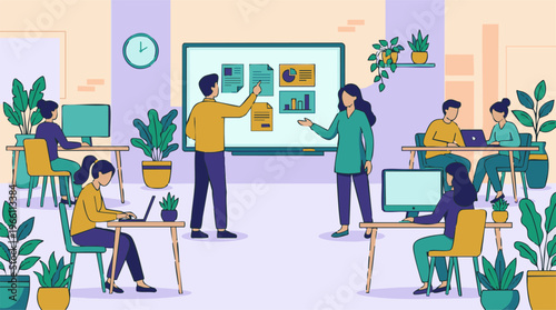Coworking center, teamwork concept vector illustration in flat style. Coworkers, colleagues characters making use of laptops and headphones.