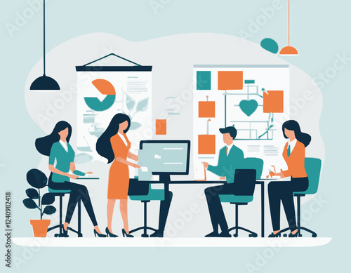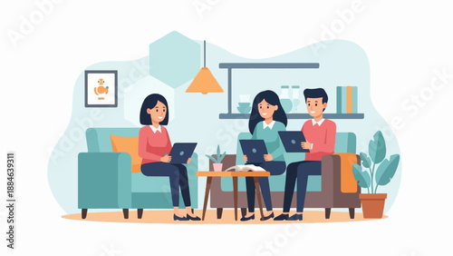 Coworking space scene set, flat vector isolated illustration. Business office center for freelancers, remote teams. People talking, working, drinking coffee, holding meeting sharing open common space.