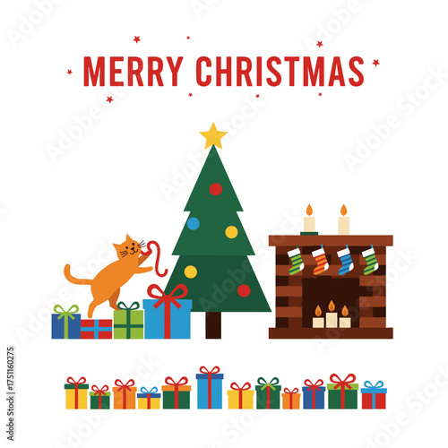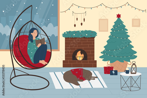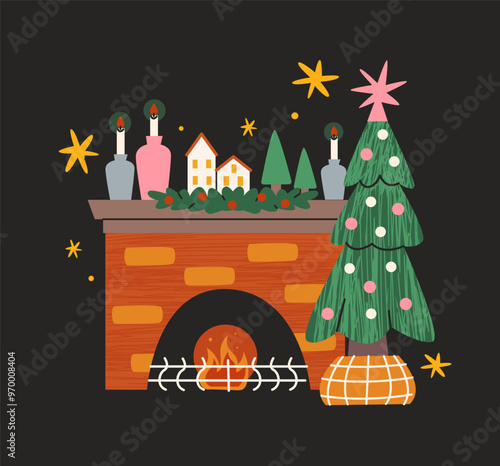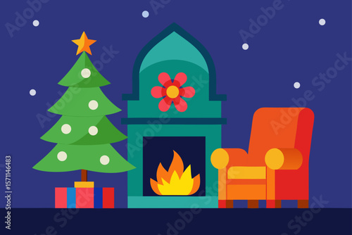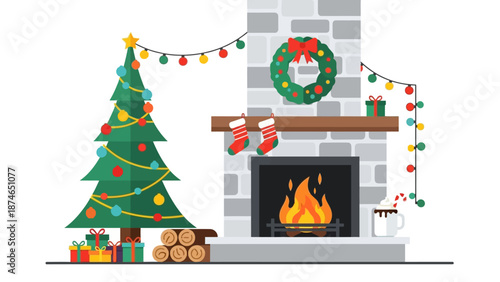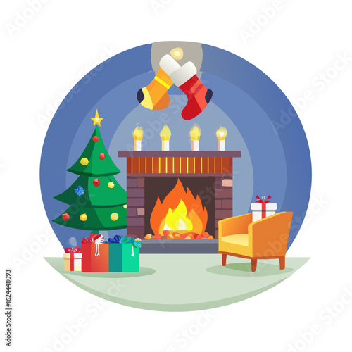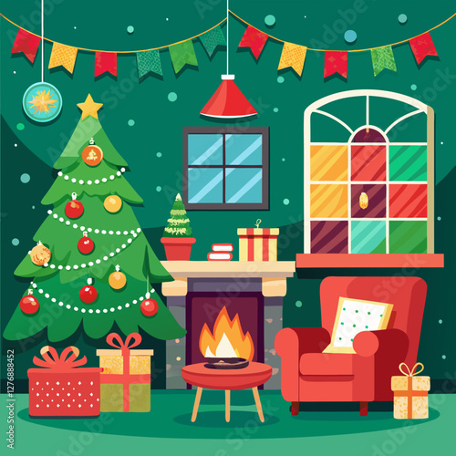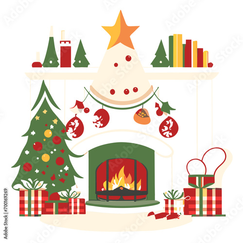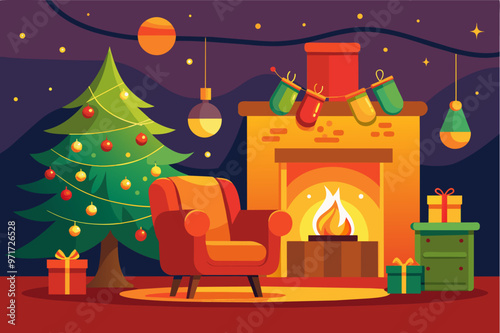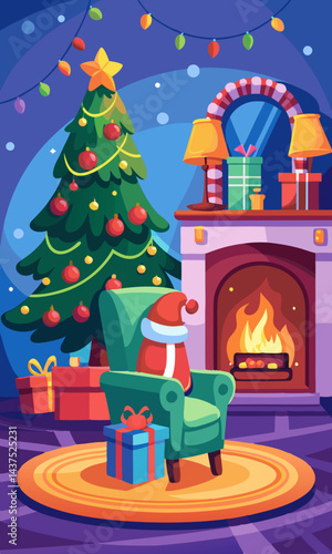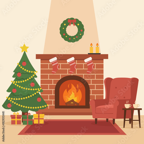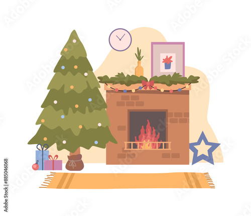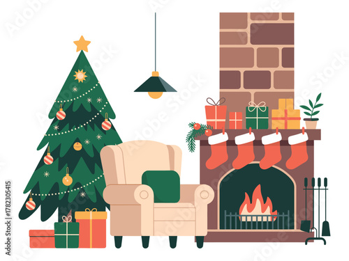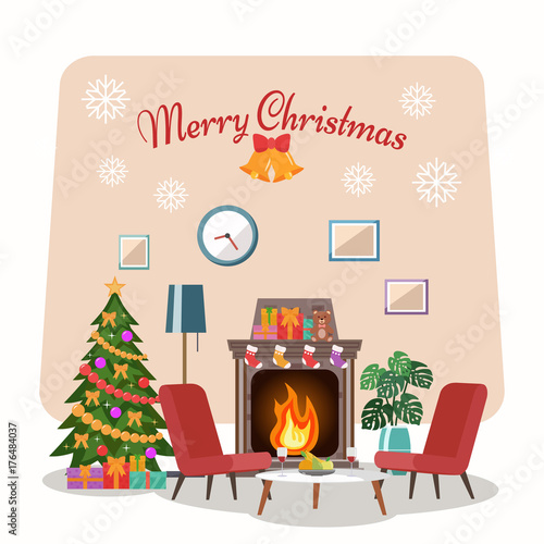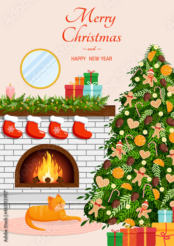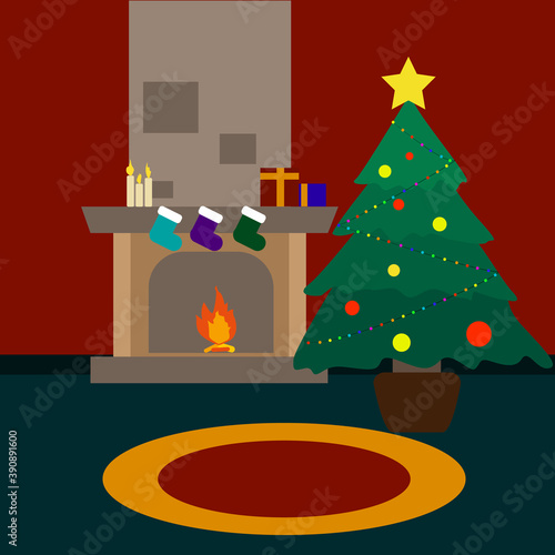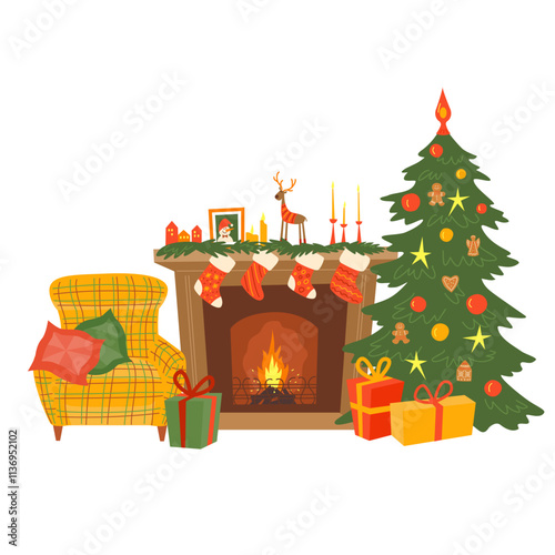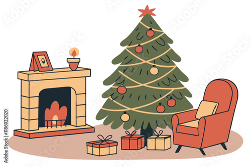 Cozy living room interior with decorated Christmas tree, fireplace, gifts, flat vector illustration. Home decoration for Christmas, New Year winter holidays celebration.