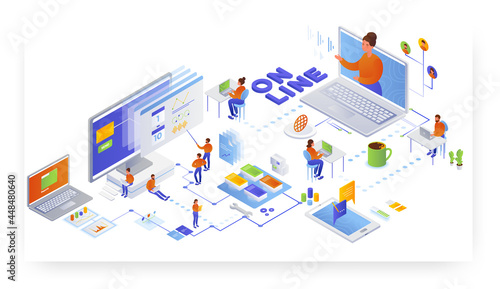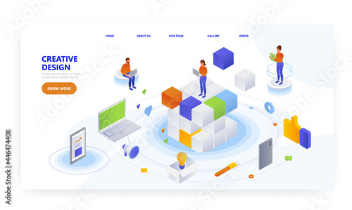 Creative design, landing page, website banner template, flat vector isometric illustration. Web design development.