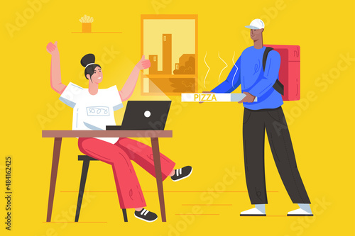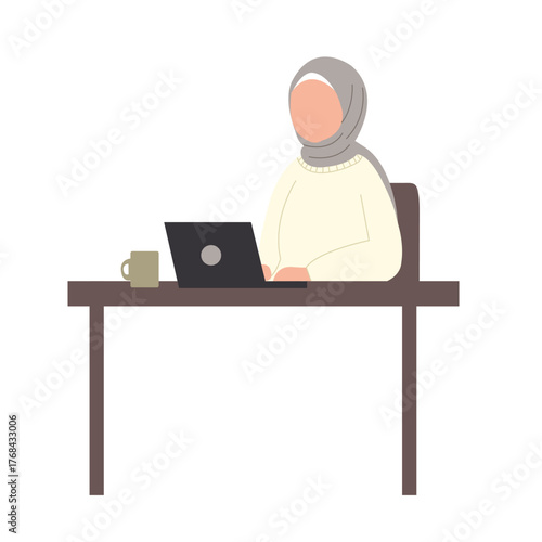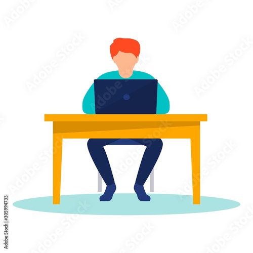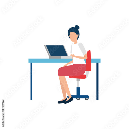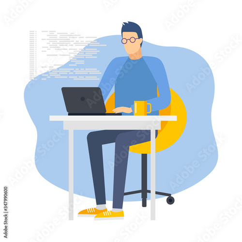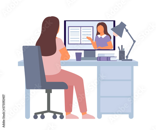 Vector illustration of graphic designer female sitting at the table and working on tablet. Creative team people flat style design element, icon isolated on white background.