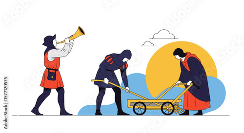 Crowd of hooligans with burning torches damaging car with clubs and stones, flat vector isometric illustration. Civil unrest, street riot, civil disorder.