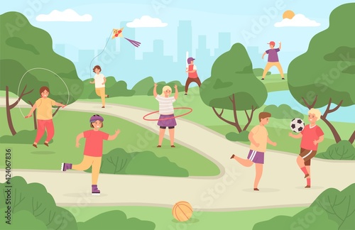 Crowd of people walking in spring city park vector illustration. Romantic couple having picnic, happy family roller skating, teenager skateboarding, grandpa rest on bench, female listening music
