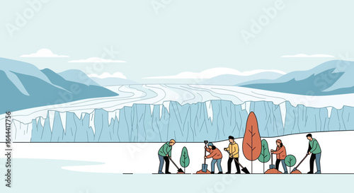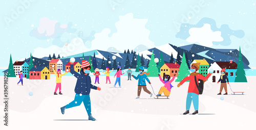 Crowd of people spending time in winter park vector illustration. Couple, parent with children characters walking, making snowman, carrying Christmas fir tree, ice skating together