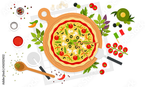 Culinary tourism vector poster, banner template. Paper cut style big delicious italian pizza and world famous landmarks around it. Gastronomic tour. Travel food experience. Italian traditional food.