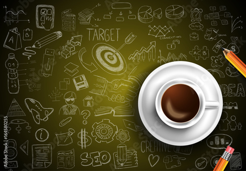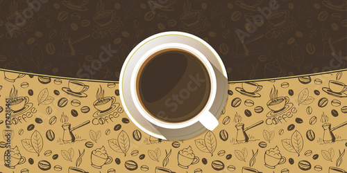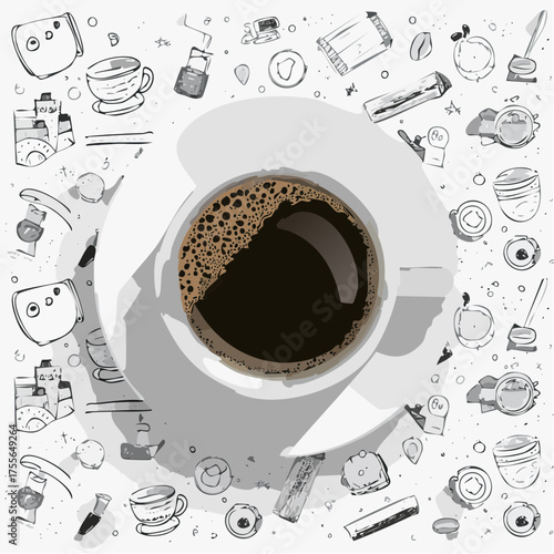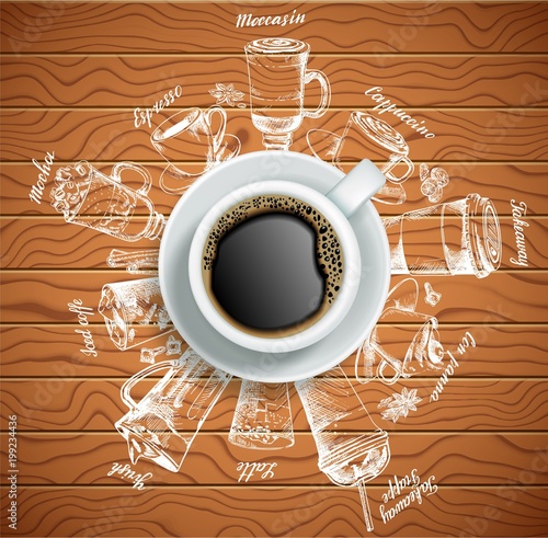 Vector realistic top view cup of black tea with hand drawn doodle tea items around it on wood background. Sketch vintage tea set.