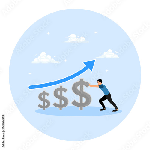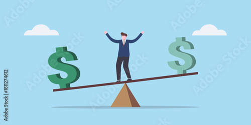 Vector illustration of human hand holding scales with euro and dollar signs and businessmen. Currency balance concept design element.