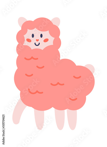 Cute alpaca vector. Funny lama walking cartoon icon. Kawaii animal smiling having fun illustration. Happy satisfied pleased mascot with fluffy curly pink wool isolated on white background