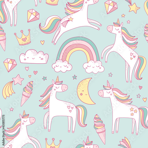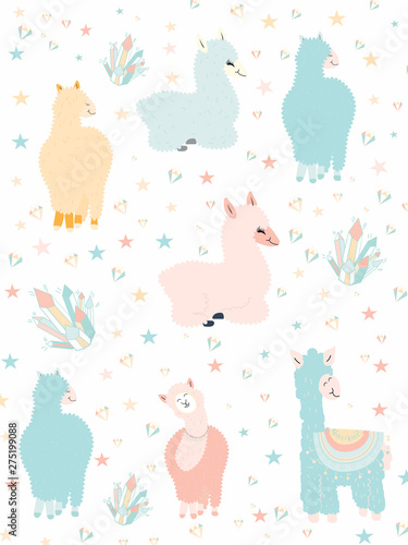 Cute alpacas with cactuses and mountains vector seamless pattern. Creative design for fabric, textile, wallpaper, wrapping paper.