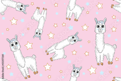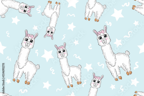 Cute white alpacas with white and pink balls of wool vector seamless pattern. Creative design for fabric, textile, wallpaper, wrapping paper.
