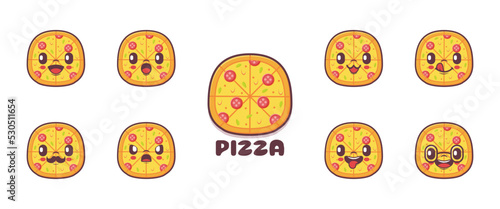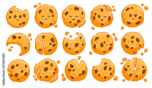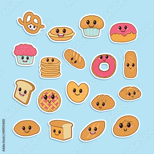 Cute and funny baking sweet dessert character set, flat vector illustration. Happy cartoon cake, muffin, donut, cookie, wafer, pretzel, croissant, pie with human faces. Pastry, confectionery, bakery.