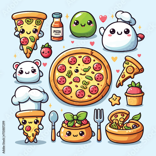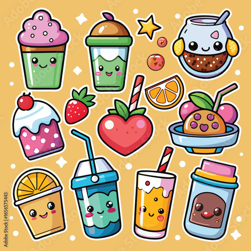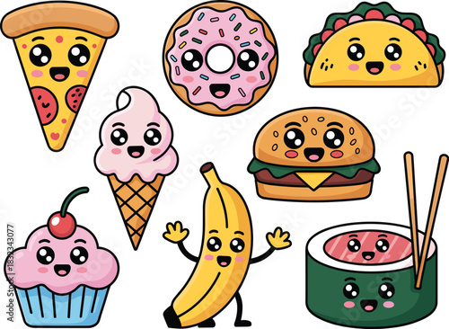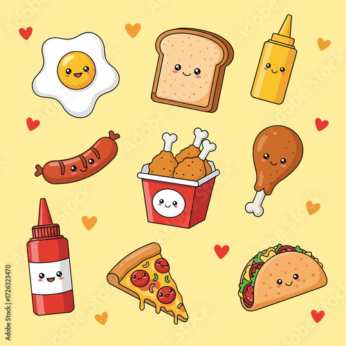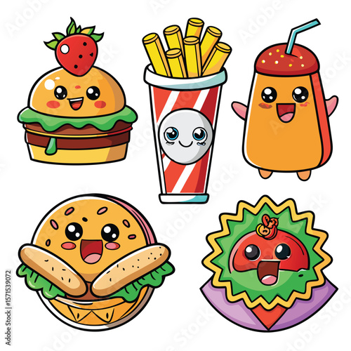 Cute funny fast food character set, flat vector illustration. Happy cartoon burger, shawarma, french fries, coffee, hot dog, pizza, chicken legs, popcorn, wok, ice cream cone with human faces.