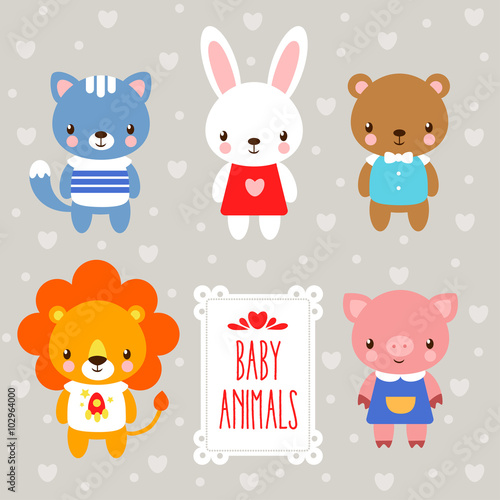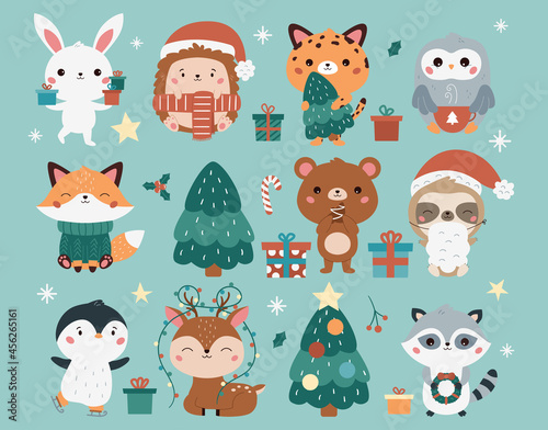 Cute animals in warm hats and scarves enjoying ice skating. Vector illustration isolated on white background. Funny little raccoon fox squirrel bear owl deer and rabbit having fun in winter.