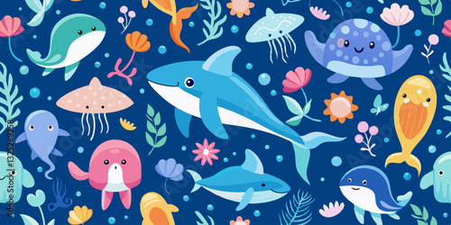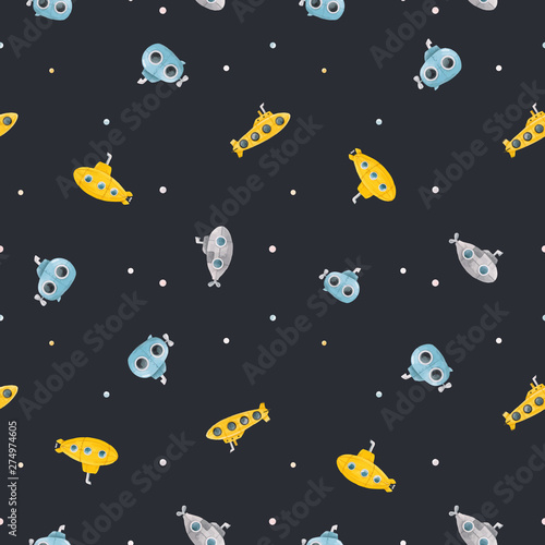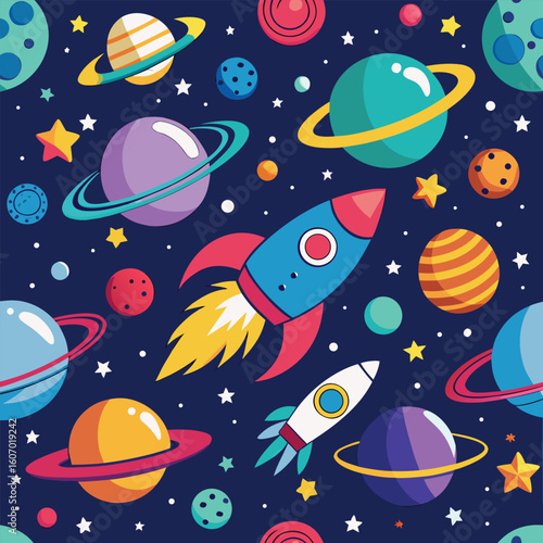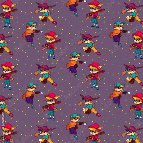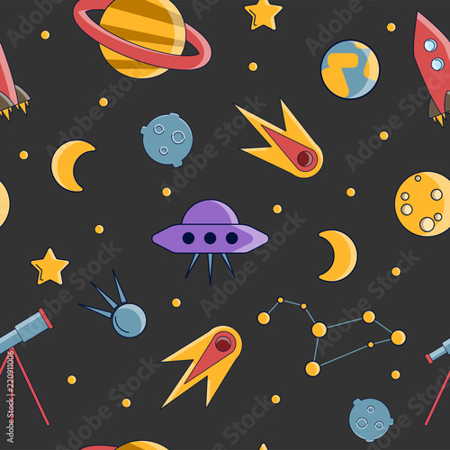 Cute animals in outer space vector seamless pattern. Creative design with funny raccoon and fox in cosmos for fabric, textile, wallpaper, wrapping paper.