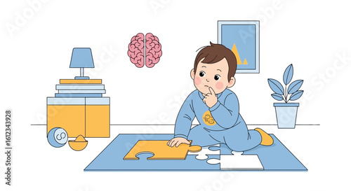 Cute boy making robot, studying robotics at robot school for children, flat vector illustration. Kids robotics engineering.