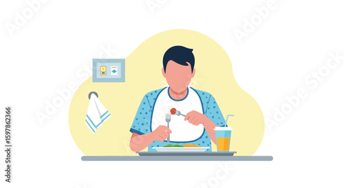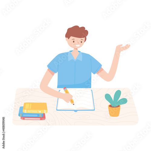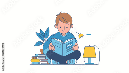 Cute boy making robot, studying robotics at robot school for children, flat vector illustration. Kids robotics engineering.