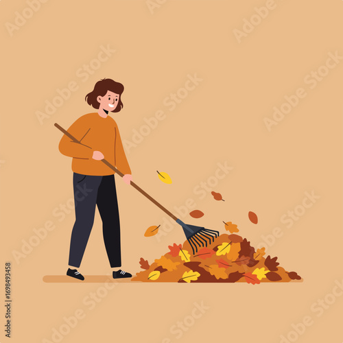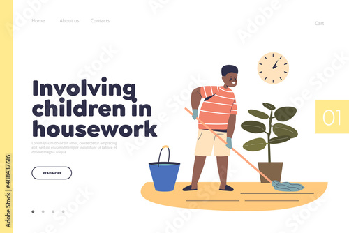 Cute boy sweeping floor with broom, helping parents with cleaning house, flat vector illustration. Kids household chores and responsibility.
