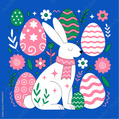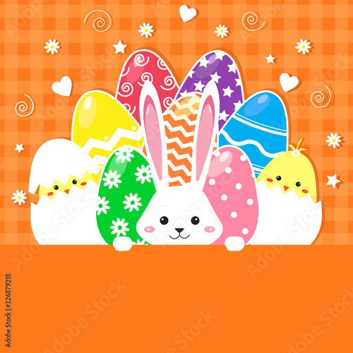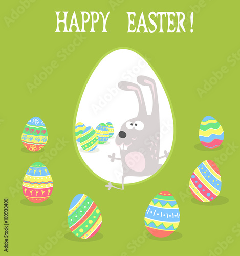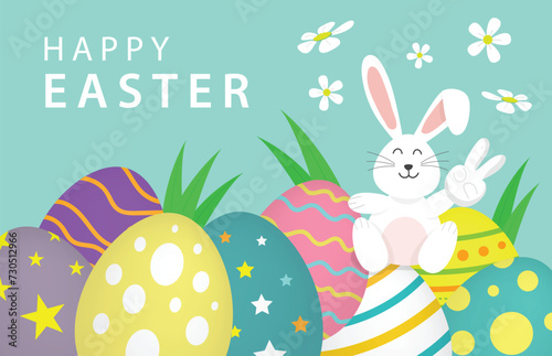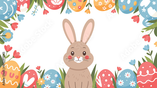 Cute bunny with Easter eggs, flowers, vector illustration in paper art craft style. Happy Easter greeting card design template.