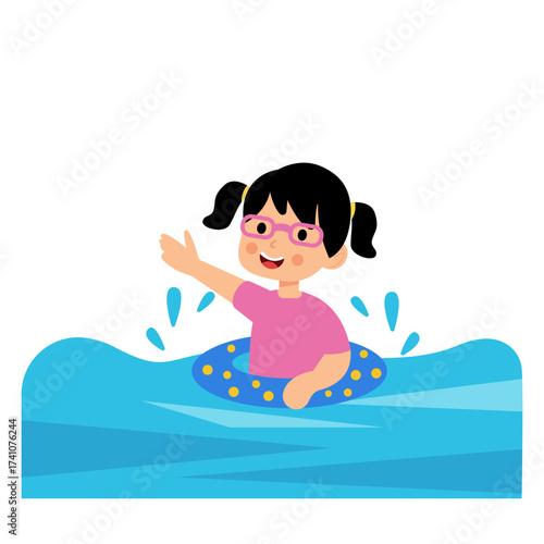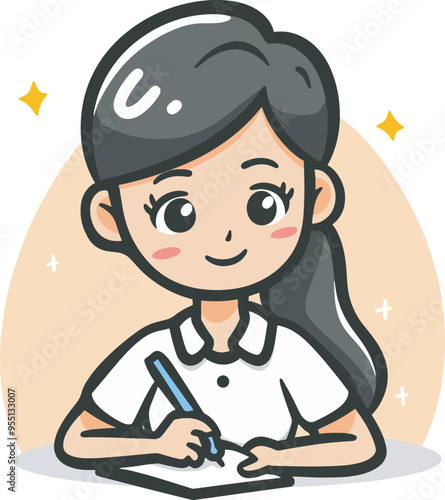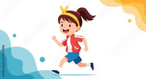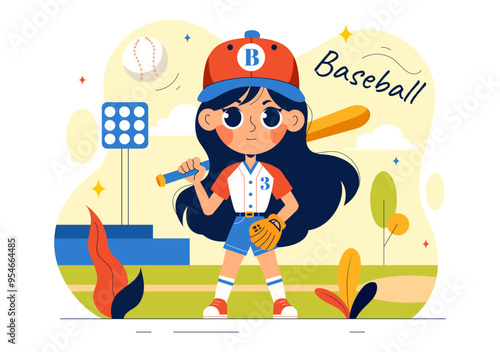 Cute happy cartoon Halloween witch fantasy character wearing costume flying on broomstick over full moon in sky vector illustration. Magic hallows eve in autumn season