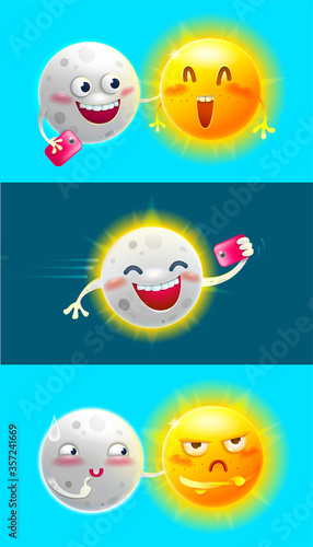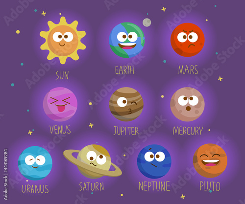 Cute cartoon Solar system planets. Paper cut Uranus Neptune Mercury Venus Mars Jupiter Saturn Earth Sun Moon with smiling faces, vector illustration. Funny childish space planet emoji. Kids astronomy.