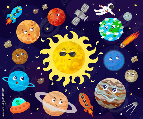 Cute cartoon Solar system planets with smiling faces, vector illustration. Uranus Neptune Mercury Venus Mars Jupiter Saturn Earth space planets orbiting Sun. Kids astronomy poster.