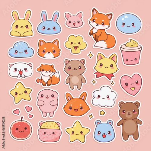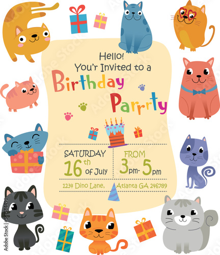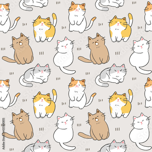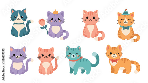 Cute cat icon set, vector hand drawn illustration. Funny kittens licking, meowing playing and eating, pet food and accessories. Greeting card, invitation, poster, sticker and print design elements.