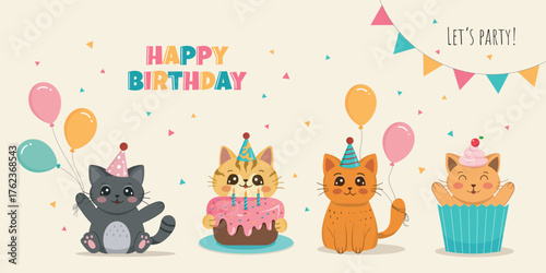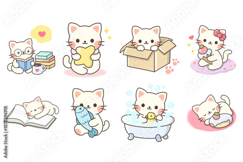 Cute cats in love. Vector illustration isolated on white background. Happy hugging, playing, holding hearts loving kittens for greeting card, invitation, poster, sticker, print.