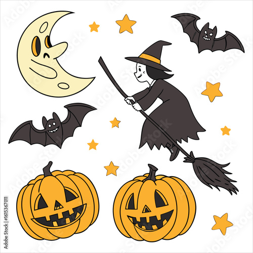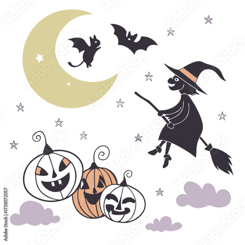 Cute charmed little witch with pumpkin and bats vector illustration. Happy Halloween autumn carnival party celebration concept