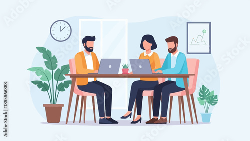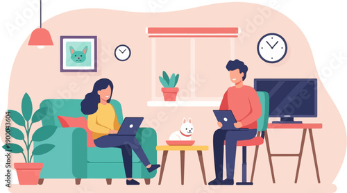 Cute couple drinking coffee and talking to each other while sitting at table in cafe, vector flat style design illustration. Young people visiting cafe. Happy romantic couple in love having date.