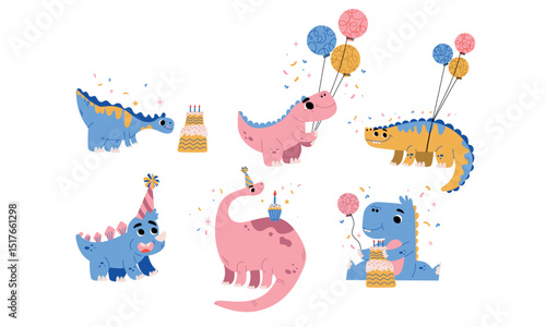 Cute dragon icon set, vector illustration isolated on white background. Fairytale medieval cartoon character. Funny mythical creature holding cake and little princess, eating lollipop, sleeping etc.