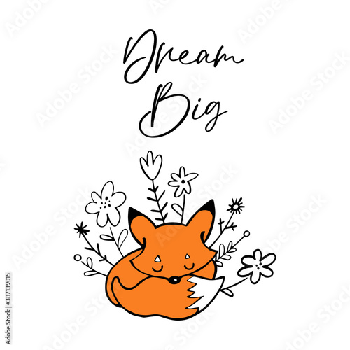 Easter vector. Cute cartoon fox character wearing funny bunny ears headband holding painted egg basket. Spring holiday animal for greeting doodle card decoration isolated on white background