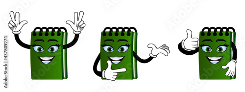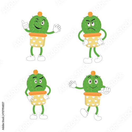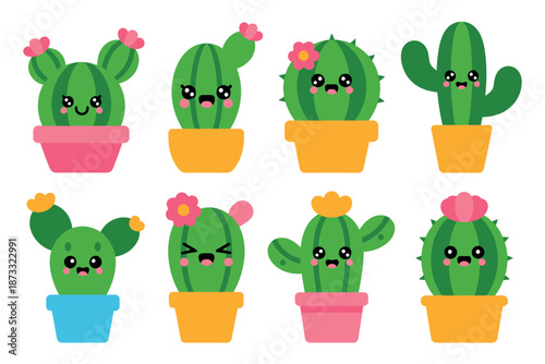 Cute cartoon cacti icon set. Vector illustration isolated on white background. Blooming cactuses with funny faces in pots for greeting card, invitation, poster, sticker, print.