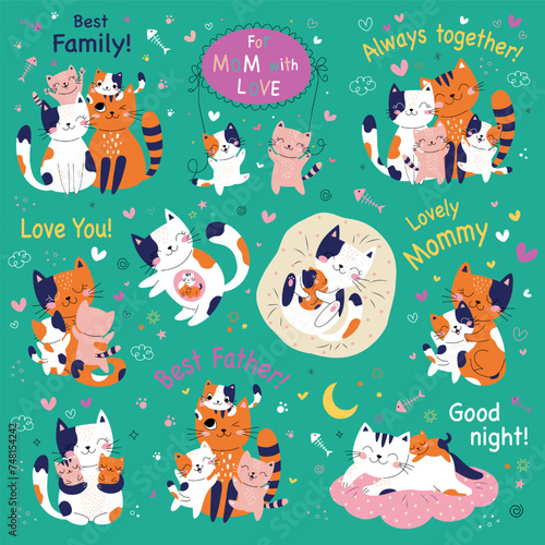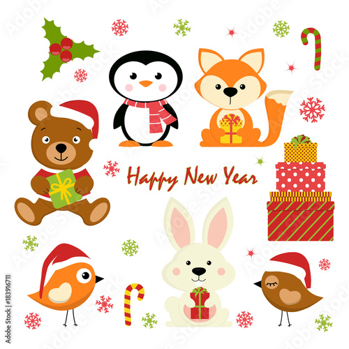 Christmas animals. Vector illustration isolated on white background. Cute raccoon hedgehog deer owl rabbit fox squirrel and bear with christmas decorations for greeting card, sticker, print.