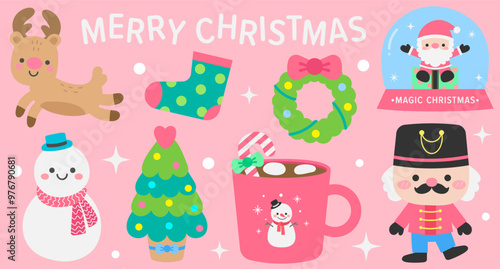 Christmas cats. Vector illustration isolated on white background. Cute kittens with deer antler headband, gifts, holly berries, christmas trees, lights, balls, socks for greeting card, sticker, print.