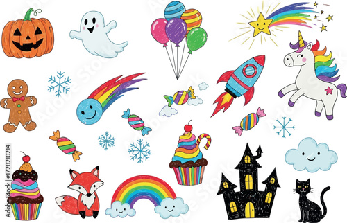 Cute animals in pilot hats and glasses. Vector illustration of raccoon fox squirrel bear deer hedgehog owl rabbit flying on airplane, hot air balloon, biplane, balloons isolated on white background.