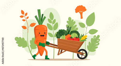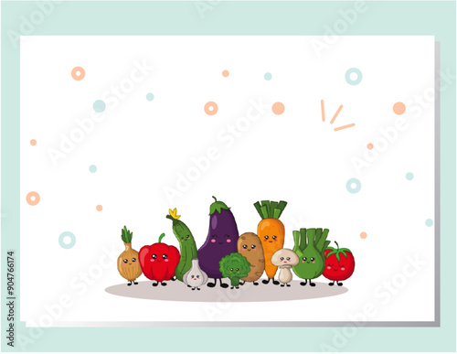 Cute funny vegetable characters in salad bowl, flat vector illustration. Happy kohlrabi, broccoli, sweet corn, onion, carrot, tomato, cucumber, pumpkin, garlic, pepper with faces. Fresh organic food.