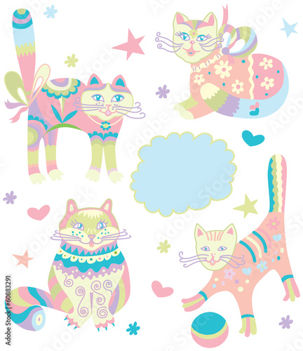 Winter cats. Vector illustration isolated on white background. Cute funny kittens wearing warm knitted hats, scarves and sweaters for greeting card, sticker, print.