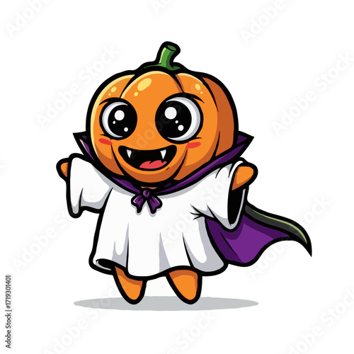 Halloween witch girl vector with pumpkin head, witchcraft hat and costume dress illustration icon isolated on white background. Autumn party celebration concept