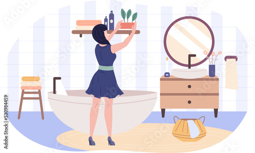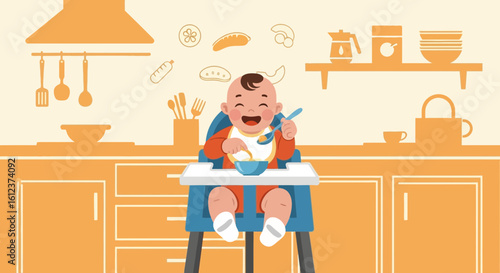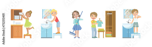 Cute girl washing dishes while standing on chair in kitchen, flat vector illustration. Kid helping her mother do household chores. House cleaning, housekeeping.