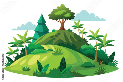 Cute jurassic dino cartoon character set, prehistoric nature, volcanoes, flat vector isolated illustration. Dinosaur era.