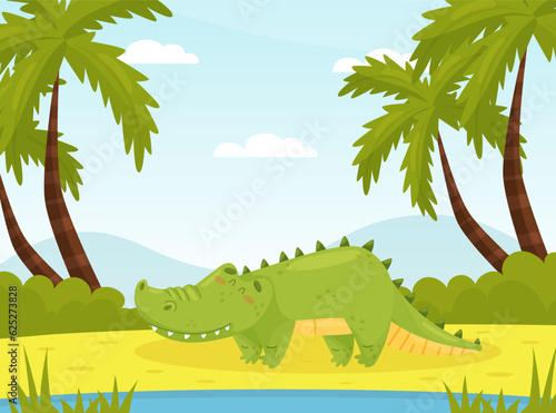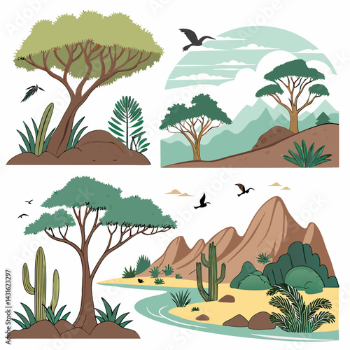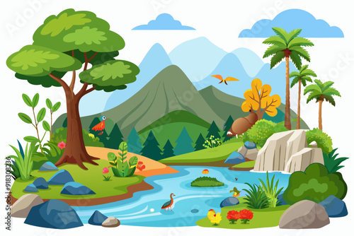 Cute jurassic dino cartoon character set, prehistoric nature, volcanoes, flat vector isolated illustration. Dinosaur era.