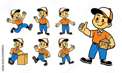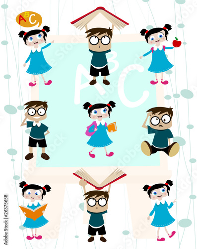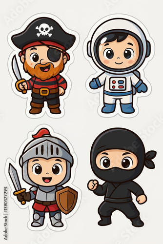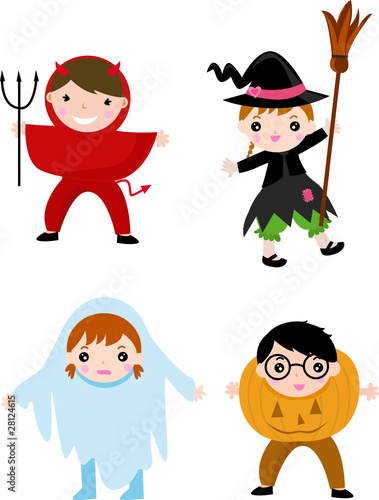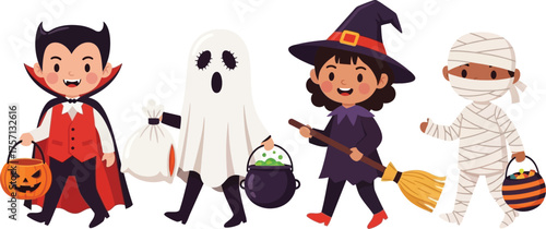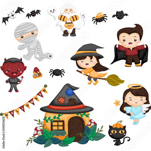 Cute little witches riding broomstick, preparing potion in boiling cauldron etc. Vector illustration isolated on white background. Halloween witches for party invitation, poster, sticker, print.